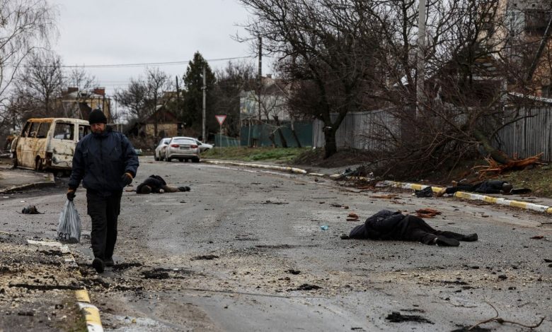 كانت جثث حوالي عشرين رجلاً بلباس مدني تنتشر في أحد شوارع بوتشا شمال غرب كييف في وضعيات مختلفة على ما أفاد صحافي من وكالة فرانس برس بعدما خرجت منها القوات الروسية ودخلتها القوات الأوكرانية.